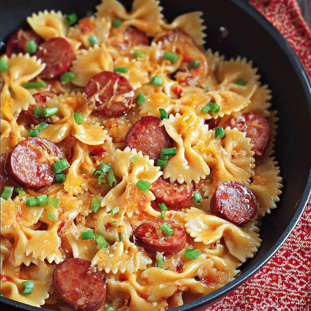 Smoked sausage, pasta, and cheese meld in a creamy skillet dinner topped with scallions—perfect for weeknights.